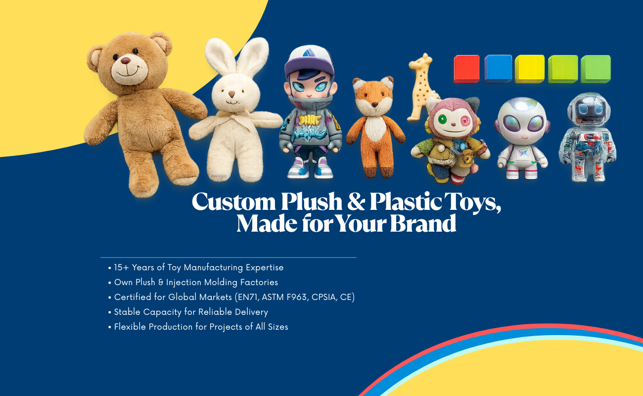 We are a full-service toy manufacturer with both plastic and plush production facilities, supported by nearly a decade of hands-on experience in the global toy industry.