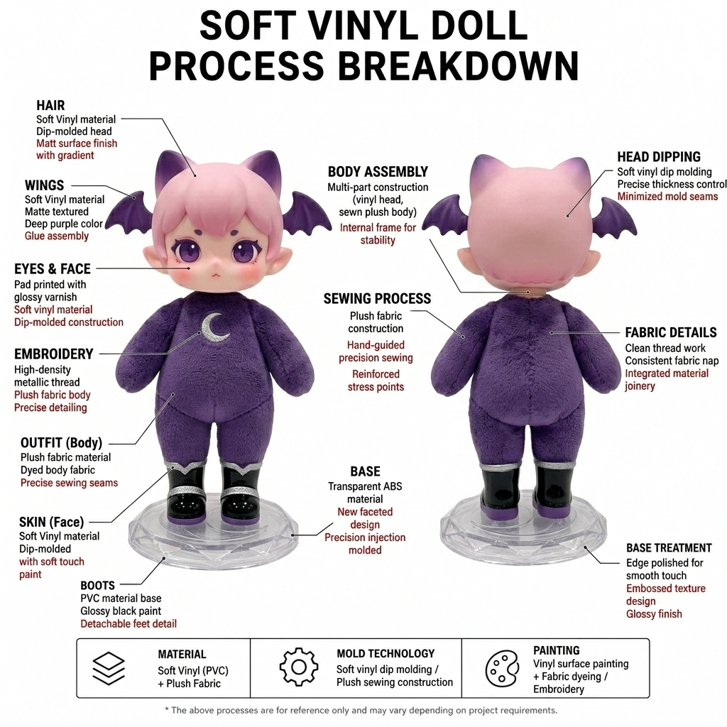 Soft vinyl (commonly known as PVC dip molding or “vinyl toys”) is a specialized process based on PVC materials, widely used in toy manufacturing for expressive character designs. In many cases, soft vinyl is combined with plush structures to create hybrid doll products.